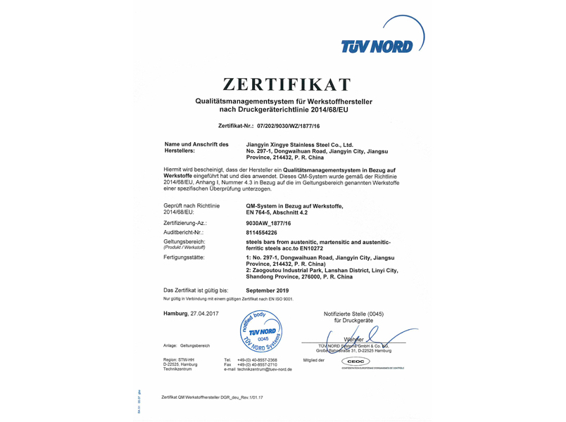 本公司按照ISO9001:2015質量管理體系的標準要求,建立了質量管理體系,并通過TUV認證